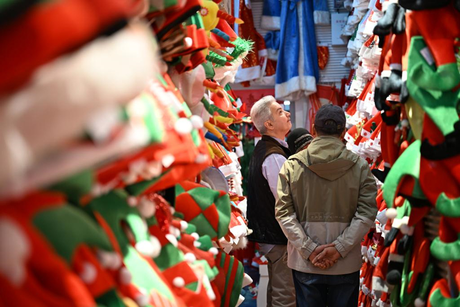 Businessmen from Kuwait select festival product samples at the Yiwu International Trade City in Yiwu, Zhejiang province, Dec. 17, 2025. [Photo/Xinhua]