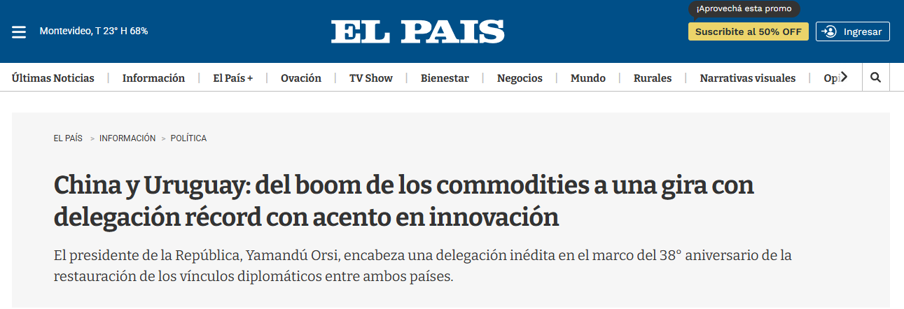 南美新闻机构Merco Press报道称,此次访问正值乌拉圭与中国建交38周年,乌拉圭总统奥尔西率领约150人的代表团启程访华,旨在“加强与乌拉圭最大贸易伙伴之间的经济联系”。
