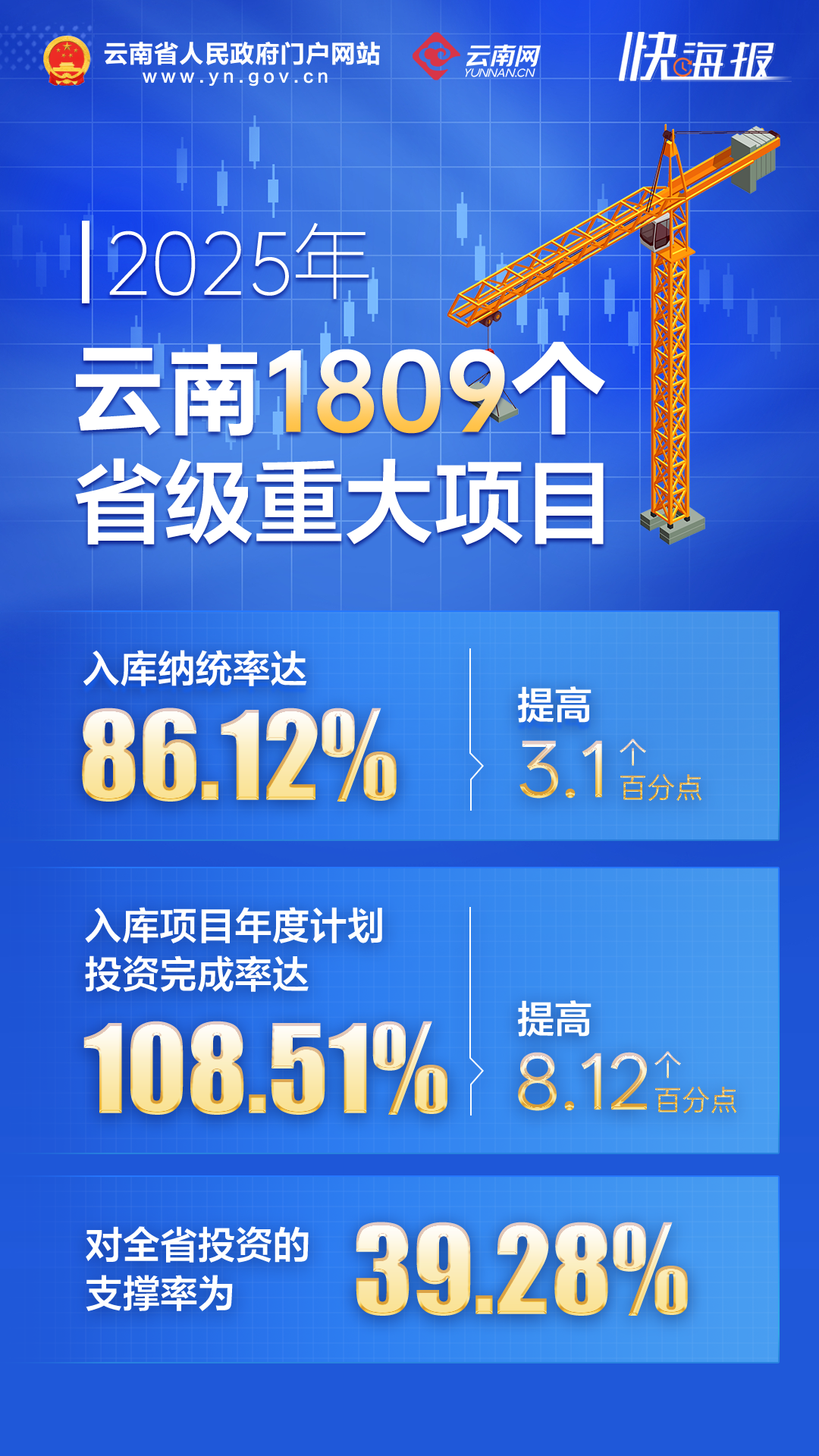 聚焦“大抓产业、大抓项目、大抓招商”,持续发挥省推进有效投资重要项目协调机制作用,强化要素保障和协调服务,2025年云南1809个省级重大项目入库纳统率达86.12%,入库项目年度计划投资完成率达108.51%,同比分别提高3.1和8.12个百分点,对全省投资的支撑率为39.28%。其中,72个“重中之重”项目年度计划投资完成率112.69%,384个民营企业投资项目年度计划投资完成率90.66%。