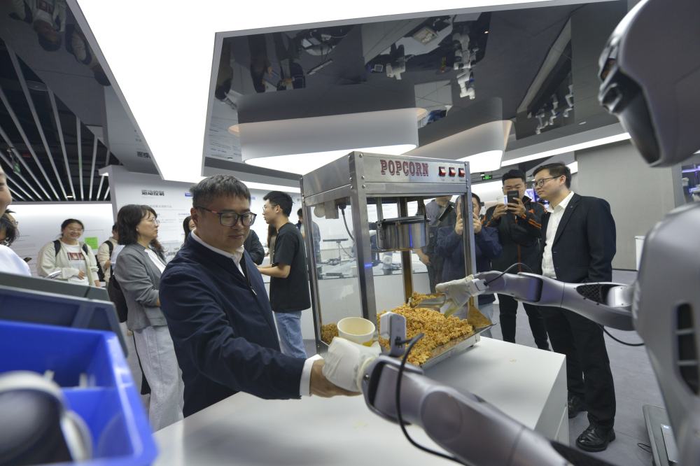 2025年10月29日,在广东深圳越疆科技有限公司,机器人为记者装爆米花。新华社记者 刘力航 摄