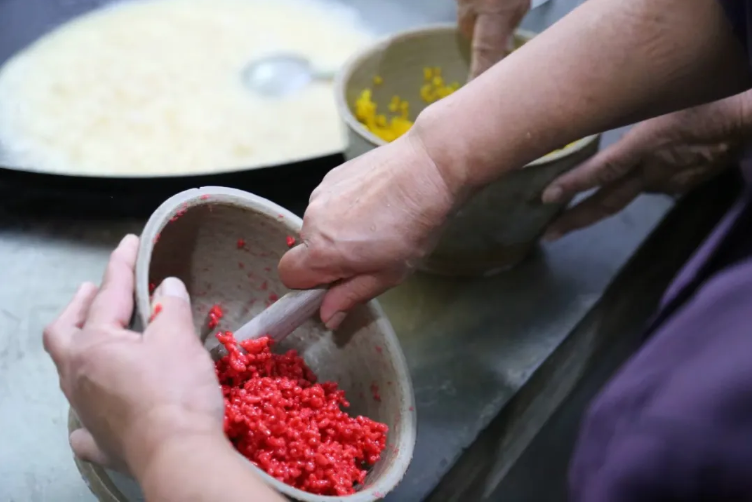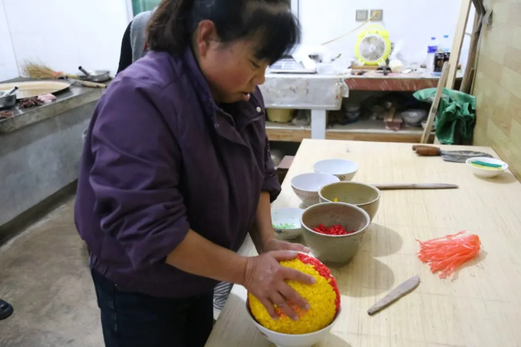 制作米花糖的20多道工序烦琐且耗时,从糯米浸泡、大火蒸制,到阴干揉搓成荫米,再到炸制米花、熬糖混合,每一步都容不得半点马虎。段磊坚持用传统铁锅熬糖、大碗定型,保留手工制作的独特质感。“现在做米花糖的人少了,但这门手艺不能丢。”她一边指导家人把控糖浆的黏稠度,一边说道,“趁着备年货的空档,我也在琢磨改进那些费力的工序,既保住老味道,又能提高效率。”