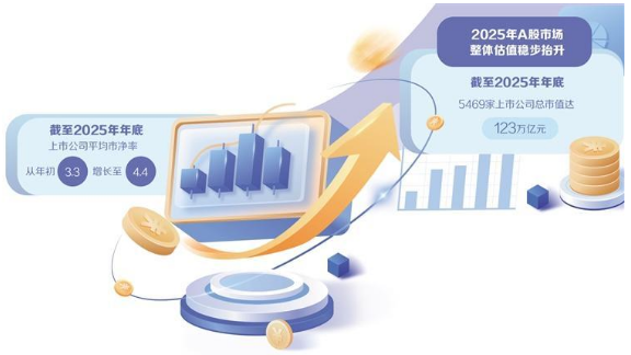 “投资有回报—资金积极入市—融资效率提升—上市公司质量提高”这一正向循环逐步形成,上市公司市值增长是客观映射。数据显示,2025年A股市场整体估值稳步抬升,截至2025年年底,5469家上市公司总市值达123万亿元,上市公司平均市净率从年初3.3增长至4.4。此外,公募基金中A股配置比重增长2.4个百分点,反映出投资者对中国经济高质量转型和企业科技创新发展的认可。