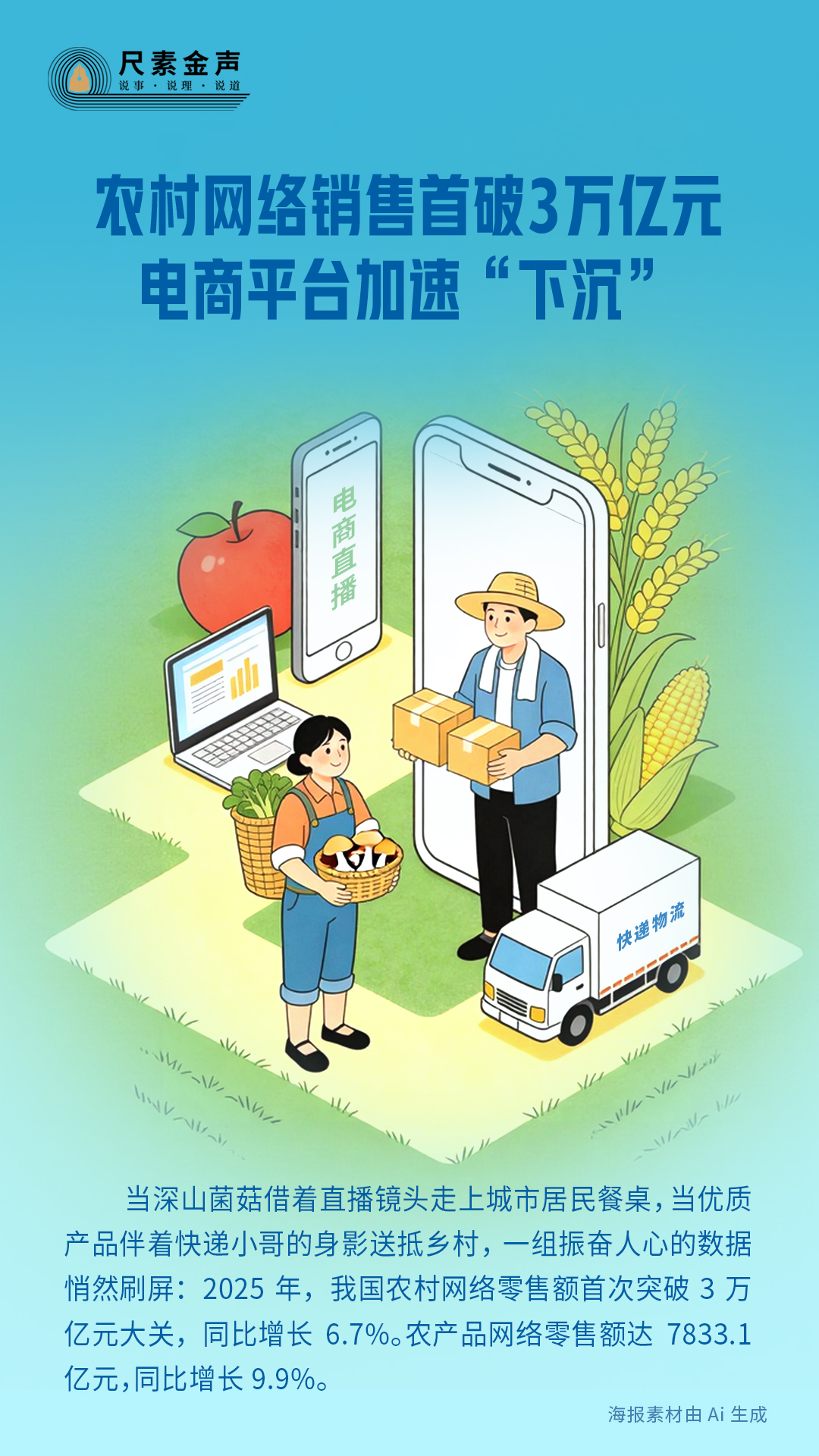当深山菌菇借着直播镜头走上城市居民餐桌,当优质产品伴着快递小哥的身影送抵乡村,一组振奋人心的数据悄然刷屏:2025年,我国农村网络零售额首次突破3万亿元大关,同比增长6.7%。农产品网络零售额达7833.1亿元,同比增长9.9%。