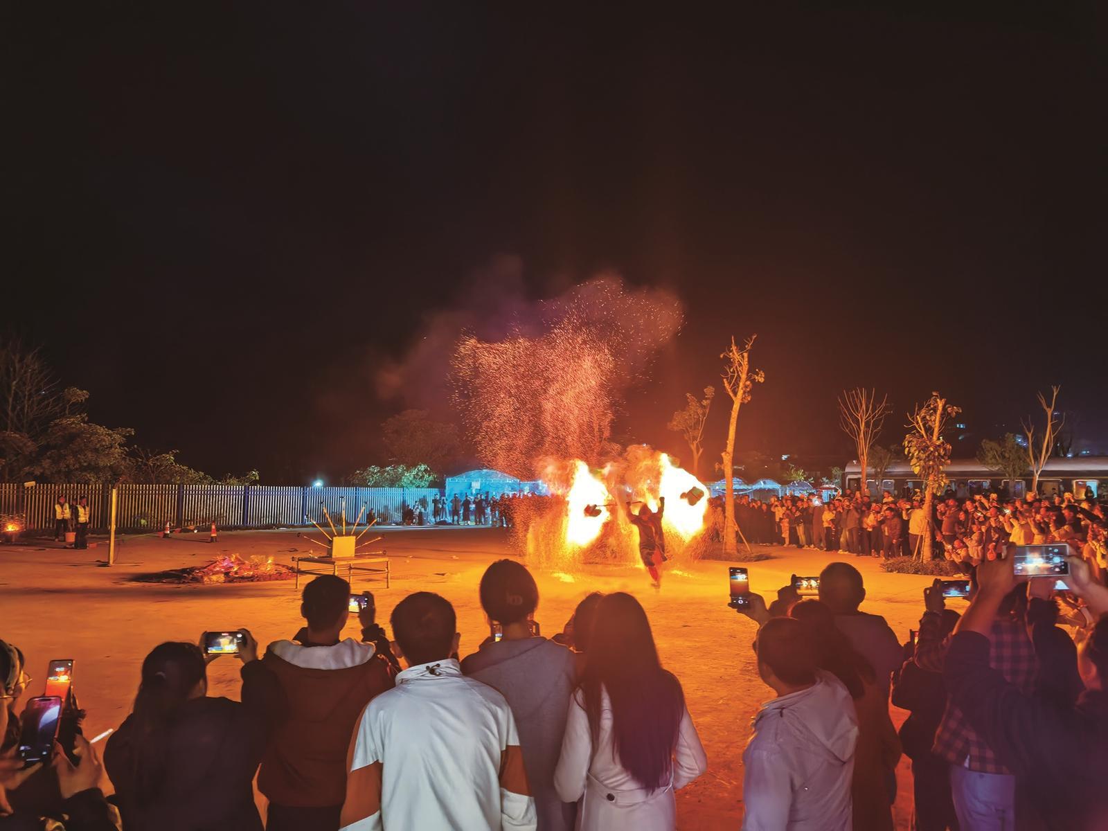 夜幕降临,篝火燃起,打歌队伍踏歌欢舞,歌声与舞步传遍街巷。打铁花、火壶表演、风火轮铁水秀轮番上演,火光璀璨、氛围热烈,年味十足。
