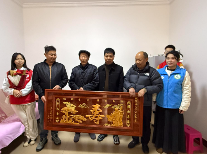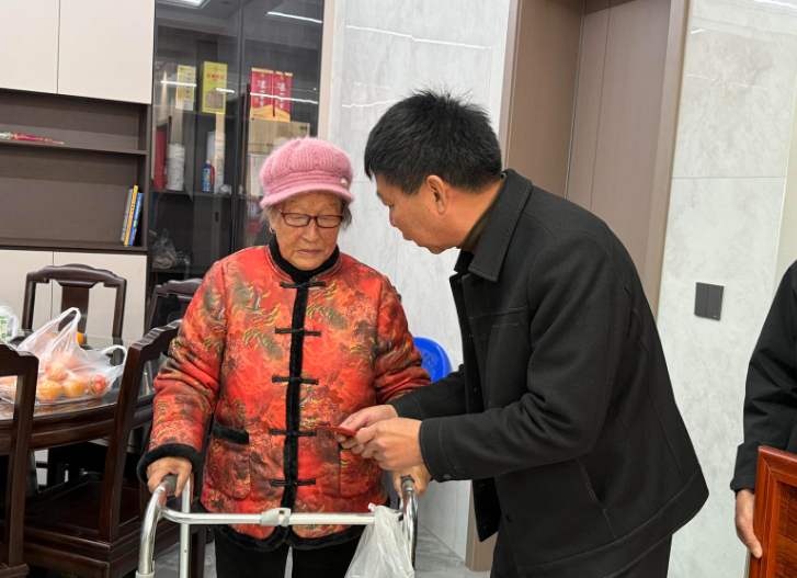 慰问现场,工作人员携带慰问金、鲜花、蛋糕等慰问品,分组入户走访高龄老人。大家与老人耐心交谈,细致询问其身体状况、饮食起居及照护情况;同时细心将蛋糕交予家属,叮嘱储存与食用注意事项,陪着老人唠家常,用朴实行动传递邻里温情,还为老人拍照留念。对今年刚满90岁的老人,工作人员特意送上“长寿匾”,以美好寓意祝福老人健康长寿、安享晚年。