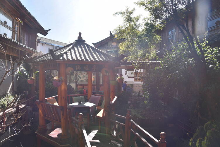 周家大院是丽江古城典型的纳西传统民居,一进两院的规整格局,历经百年依旧风骨犹存。厚重温润的青石板踏步石,被几代人的脚步磨得光滑;雕刻繁复精美的六合门,纹样间藏着纳西工匠的巧思;高挑舒展的檐、院内葱郁的老树,无一不在诉说着这座老宅的深厚底蕴。如今院落虽经改造,添上了现代客栈的陈设,却依旧保留着纳西民居独有的庄重与雅致,一脚踏入,便能感受到时光沉淀下来的厚重气息。