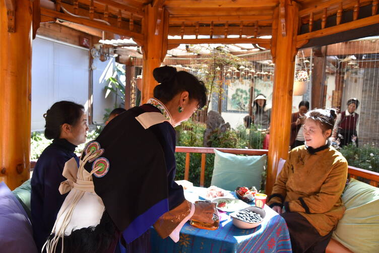 她和家人一起将精心制作的纳西甜品一一摆上桌,与大院里的租客们一同分享。来自山西的张容菥,已是在丽江生活八年的新丽江人,第一次来丽江,她便被古城院落、小桥流水、蓝天白云以及“20度的丽江”的慢生活深深吸引,于是就此扎根成为客栈经营者。品尝到地道的纳西咕谷后,她忍不住赞叹这份甜品的精致与美味,更为纳西民族的生活智慧与文化底蕴深深折服。对无数像张容菥一样奔赴丽江的人而言,这座古城不仅有慢时光,更有藏在烟火里的文化温度。