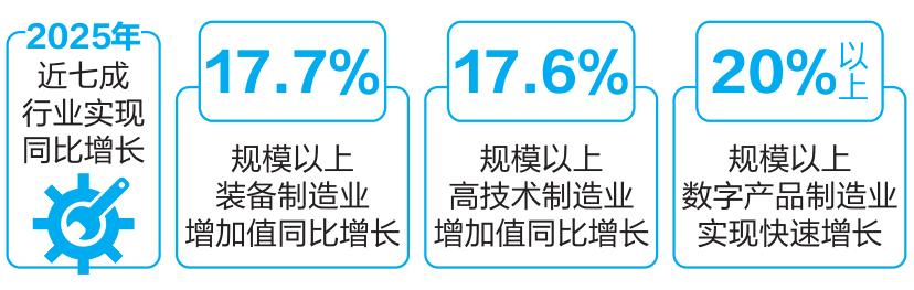 装备制造业较快增长,重点产业质效提升。2025年,全省规模以上装备制造业增加值同比增长17.7%,增速快于全省规模以上工业13.2个百分点,对全省规模以上工业增加值增速贡献率为28.6%。主要装备行业中,电子行业、金属制品业和电气机械行业实现较快增长,增加值同比分别增长22.7%、19.5%、8.5%。