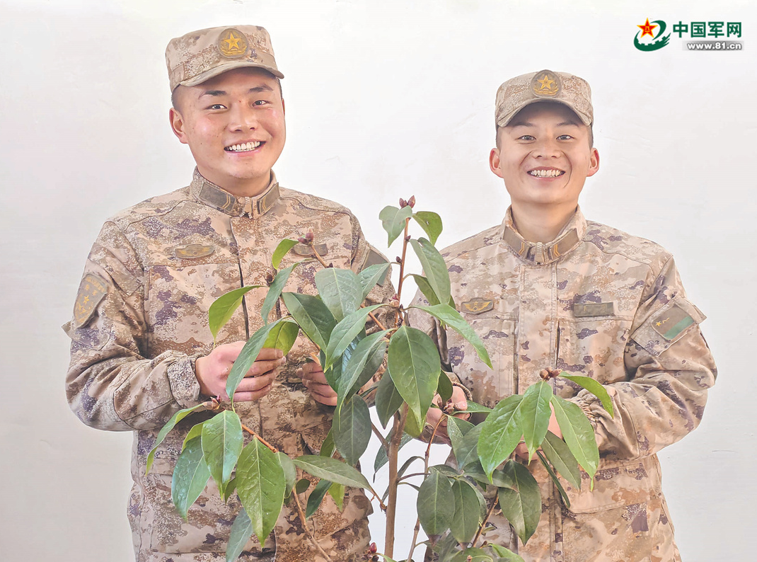 去年初春,云南一支慰问团前往查果拉哨所,从事花卉培育工作的云南省“最美退役军人”夏宇特意为大家带来两株耐寒、耐旱的山茶花树苗,希望为这里添一抹色彩。官兵把树苗安置在温度相对恒定的阳光房。雪松专门购置了一个可精准调节出水量的喷壶,坚持每日少量多次地为山茶花补水,他还时常向夏宇请教,严格按配比施肥,悉心呵护这些来之不易的绿色。