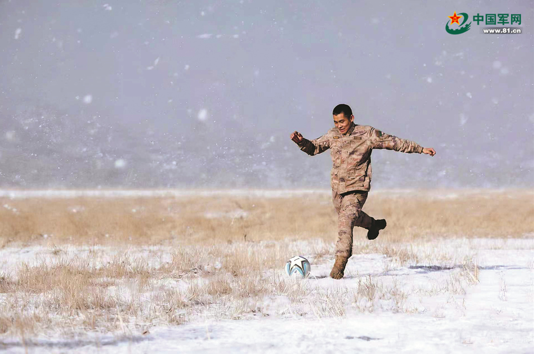 新疆军区科加尔特边防连战士参加雪地足球赛。解放军报特约记者 王军强 摄