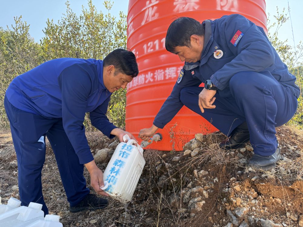 在南尧卡点,队员们逐一对进山车辆后备箱、车厢进行筛查,确认无易燃物后放行;在护林防火观测点,他们沿着防火隔离带来回巡逻,目光紧盯林区动向,俯身检查森林消防蓄水桶水位。“南尧这个点地势比较高,视野开阔,所以我们把这个点设为护林防火观测点,春节期间防火形势比较严峻,我们一般每天都来2至3趟。”副队长沙学杰介绍。