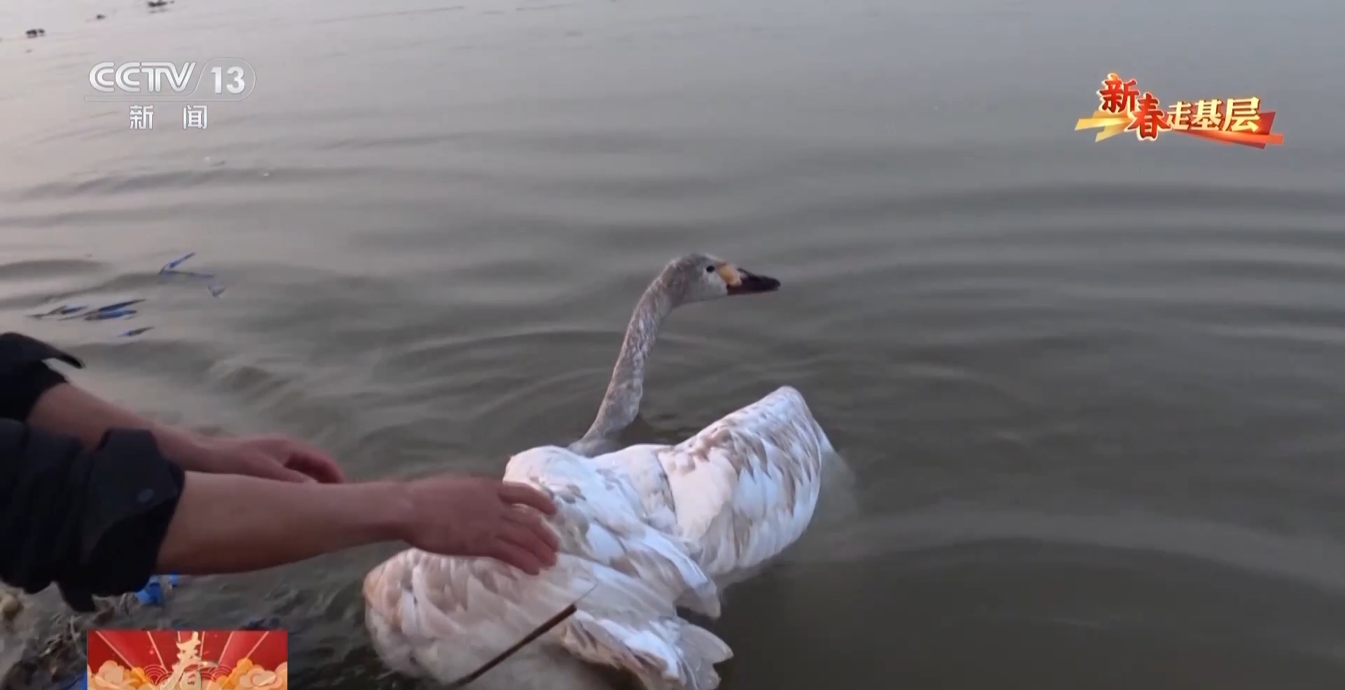 陈新凯小心翼翼地走进湖里,剪开缠在小天鹅翅膀上的网绳。