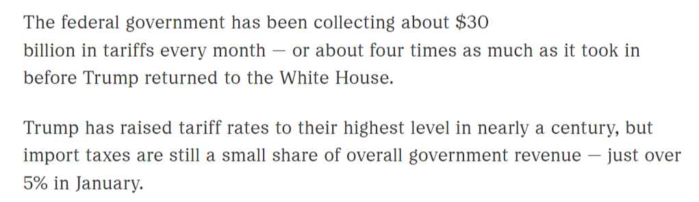 美国联邦政府每月征收约300亿美元关税,这几乎是特朗普重返白宫前关税收入的四倍。特朗普已将关税税率提高到近一个世纪以来的最高水平,但进口关税仍占整体政府收入的小部分,今年1月份这一比例仅略高于5%。