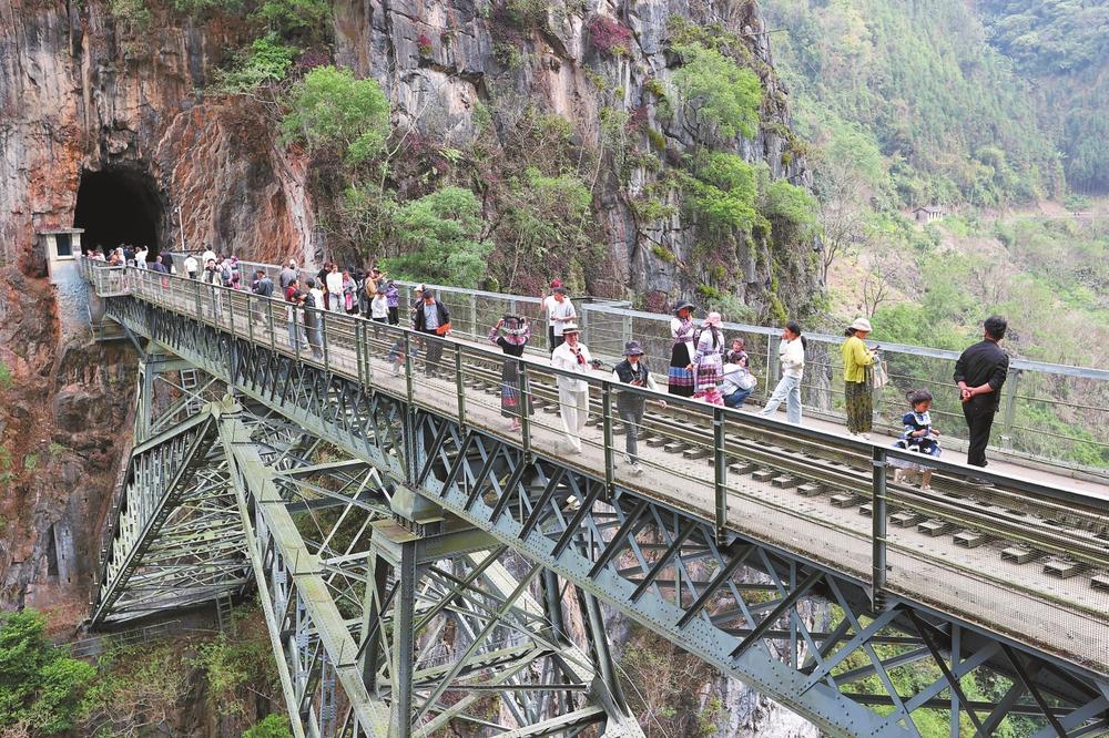 游客漫步屏边县滇越铁路人字桥。记者 雷桐苏 摄