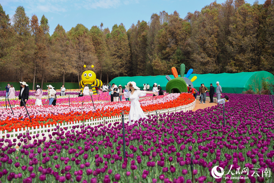 春节期间,云南昆明捞渔河国家湿地公园内百万株郁金香迎来盛花期,红、粉、紫等各色花朵连片绽放,交织成绚丽花海,为新春佳节增添了浓浓春意,成为游客休闲打卡的热门去处。(人民网 记者李发兴)