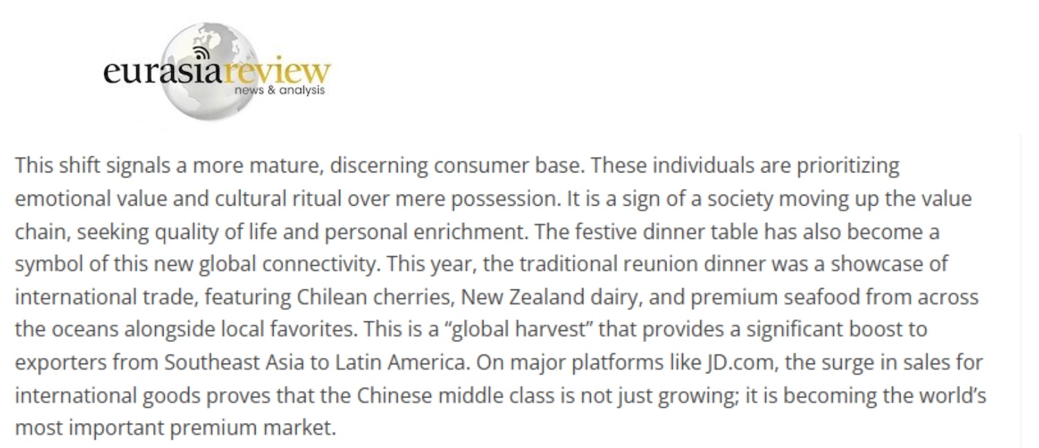 文章称,这种转变标志着中国消费者变得更加成熟、更具品位。他们更注重情绪价值和文化仪式感,而不仅仅是物质追求。这象征着社会正朝着价值链上游迈进,追求生活品质和个人提升。节日的餐桌也已成为这种新型全球互联的象征。今年,传统年夜饭成为国际贸易的展示窗口:既有智利车厘子、新西兰乳制品和来自大洋彼岸的优质海鲜,也有本地美食。这是一场“全球丰收”,为从东南亚到拉丁美洲的商品出口提供了强大动力。在跨境电商平台上,国际商品的销售激增证明了中国正在成为全球最重要的高端消费市场。