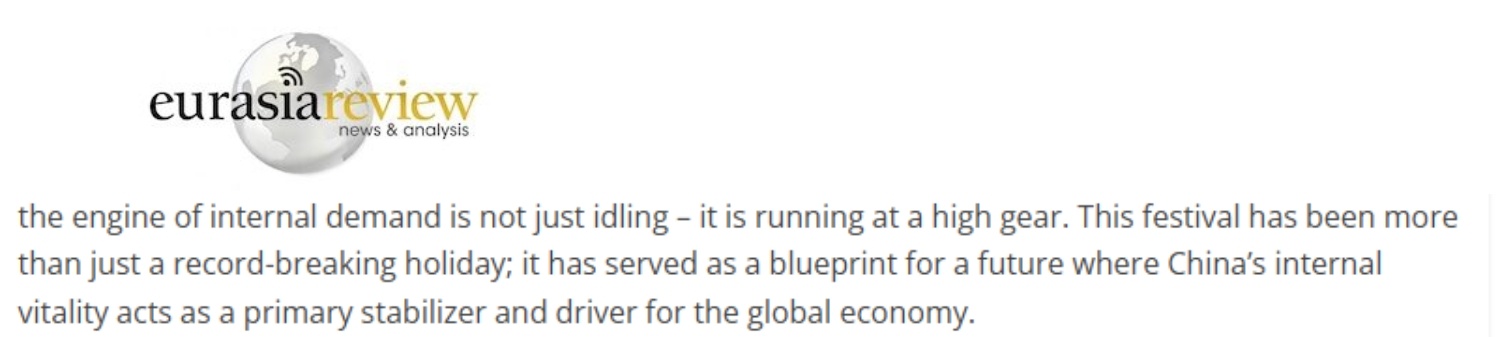 文章最后说,春节消费热潮表明,内需引擎非但没有空转,反而在高速运转。这个春节的意义不仅仅在于其破纪录的假期数据,而是在于它绘制了一幅未来蓝图:中国的内在活力将成为全球经济的主要稳定器和驱动力。