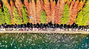 图为2025年12月10日,游客在云南省昆明市滇池畔的海洪湿地公园喂红嘴鸥(无人机照片)。 新华社文/图