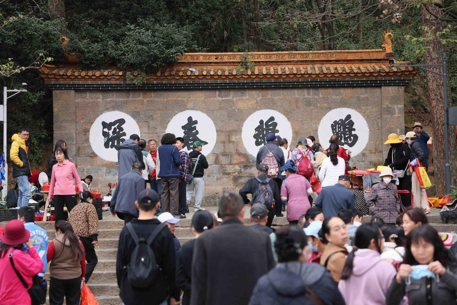 清晨的鸣凤山还带着些许晨雾,金殿名胜区的入口处已是人头攒动,不少市民游客早早赶来,延续着老昆明初九赶金殿的传统。开屏新闻记者来到金殿名胜区,沿着一天门、二天门、三天门的石阶向上走,沿途张灯结彩,与盛放的山茶花相映成趣,喜庆的年味扑面而来。从山脚到太和宫,一路上摩肩接踵,老人牵着孩子、家人结伴同行,每个人的脸上都洋溢着笑意。