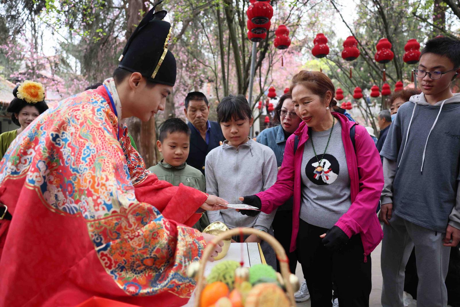 今年庙会全新推出的“神行甲马·乐赏山茶”古风游园打卡活动,成为现场的一大亮点。紫薇园的锦鲤仙子、秋园的陈圆圆、钟楼的山茶花神等NPC与游客亲切互动,沉浸式的游园体验让年轻游客流连忘返。600余亩的山茶园内,40余万株山茶花竞相绽放。逛完庙会的游客纷纷漫步茶花园,在姹紫嫣红的花树下拍照留念,一边欣赏春日美景,一边感受自然之趣。