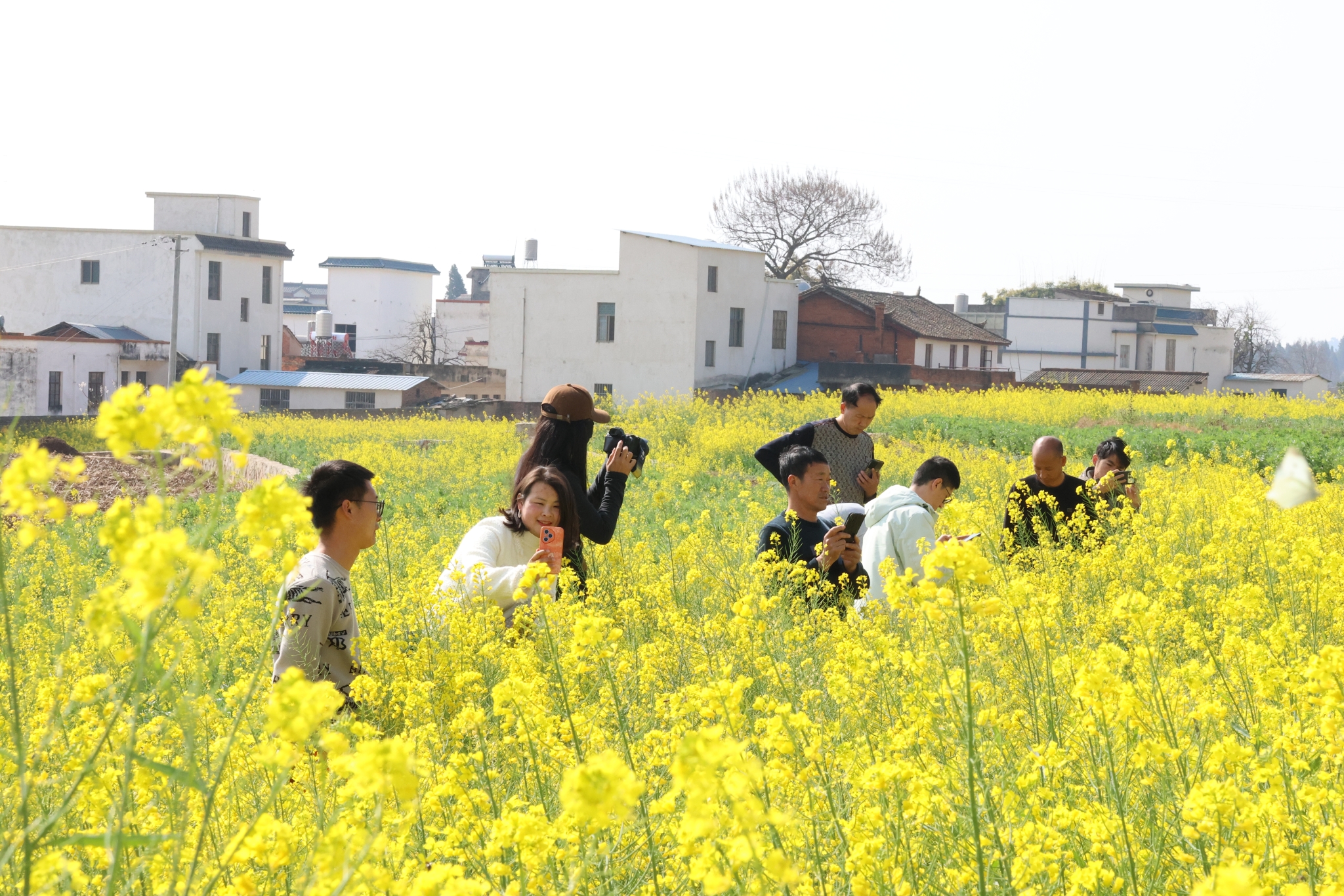 走进沾益区西平街道九龙社区,目之所及皆是蓬勃的生机。金色的油菜花沿着地势层层铺展,从村口延伸至山间。微风拂过,花浪翻滚,阵阵清甜的花香扑面而来。游客们三五成群,或漫步花海、轻声闲谈,或驻足拍照、记录美景,欢声笑语萦绕在花海之上。