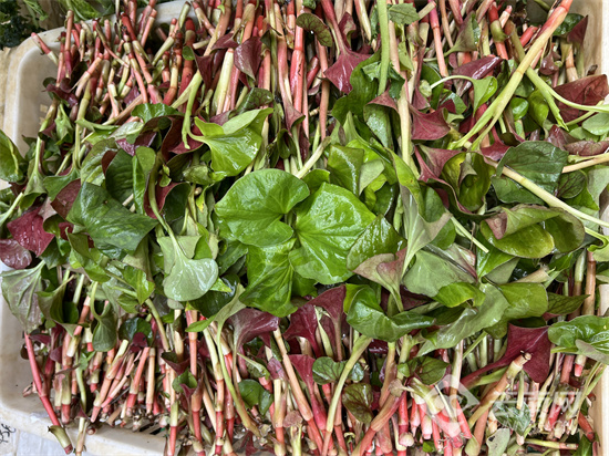 与春花相映成趣的,是琳琅满目的春菜。鲜嫩紫红的香椿被扎成小捆整齐摆放,散发着独特的香味。摊主介绍,春节前市面上售卖的大多是外地香椿,节后随着气温回升,本地香椿已大量上市,价格也更加亲民,“现在每公斤售价在60元到80元不等,比之前便宜了不少。”
