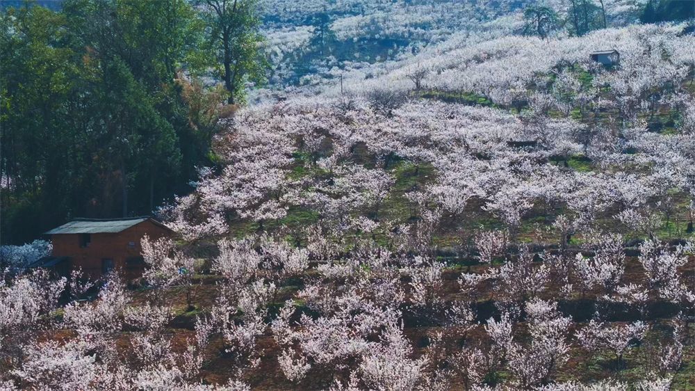 楚雄州武定县大石房村,万亩樱桃花如雪绽放,铺满山坡。沿着山路蜿蜒而上,雪白花海与静谧村庄相映,仿佛走进一幅恬静的田园油画。