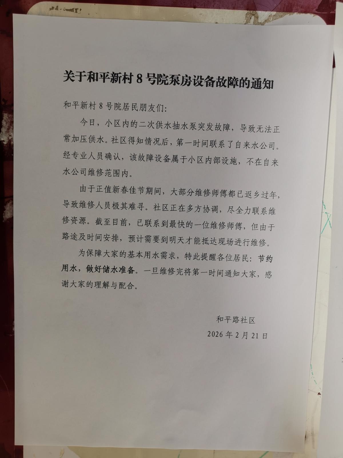 2月21日张贴的《关于和平新村8号院泵房设备故障的通知》显示——