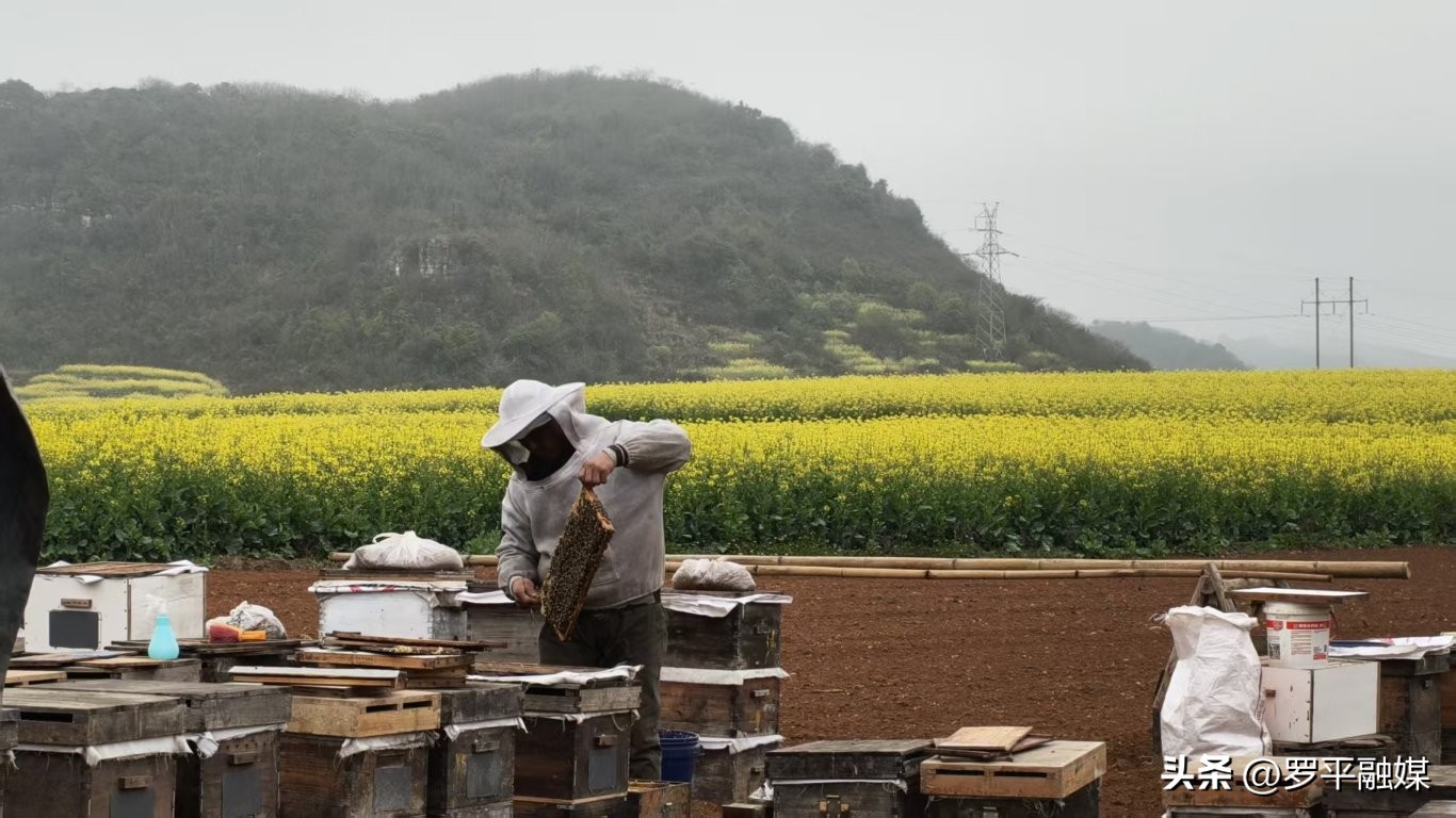 来自吉林的养蜂人杨位君正弯腰取蜜。他戴着防蜇帽,掀开蜂箱,提起一板巢脾,轻轻一抖,金黄的蜂蜜顺着蜂蜡淌下来,空气里霎时灌满甜香。“我是从吉林过来的,每年这里油菜开花的时候,我们就会过来。这里花海面积大、蜜源好,特别适合采蜜。”杨位君已在罗平安营扎寨七年。