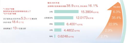 风电光伏合计装机历史性超过火电,由2020年的5.3亿千瓦增加到2025年的18.4亿千瓦,连续跨越13个亿级台阶。