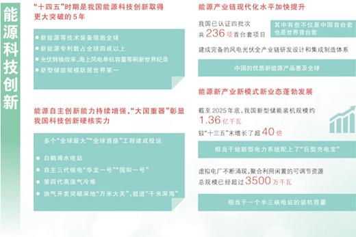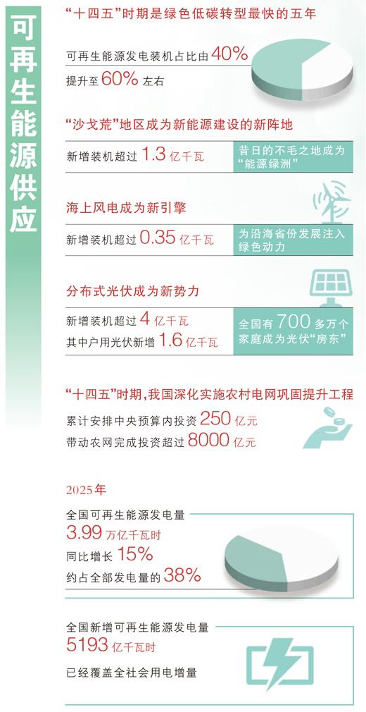 国家能源局发布的数据显示:截至2025年底,我国可再生能源总装机达到23.4亿千瓦。“十四五”时期,我国建成全球最大、发展最快的可再生能源体系,可再生能源装机占比由40%提升至60%左右。