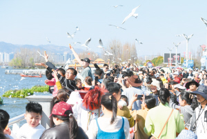 海埂大坝人鸥同乐。 本组图片记者王俊星摄