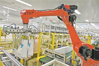 一家净水互联工厂生产线上,工业机器人在传送产品。