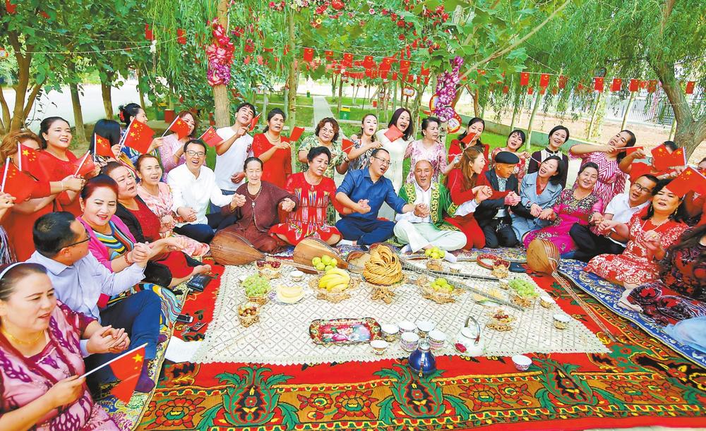 宁波市援疆干部、库车市融媒体中心职工与萨克萨克街道惠民社区居民同唱《我和我的祖国》。尼亚孜·热合曼 摄