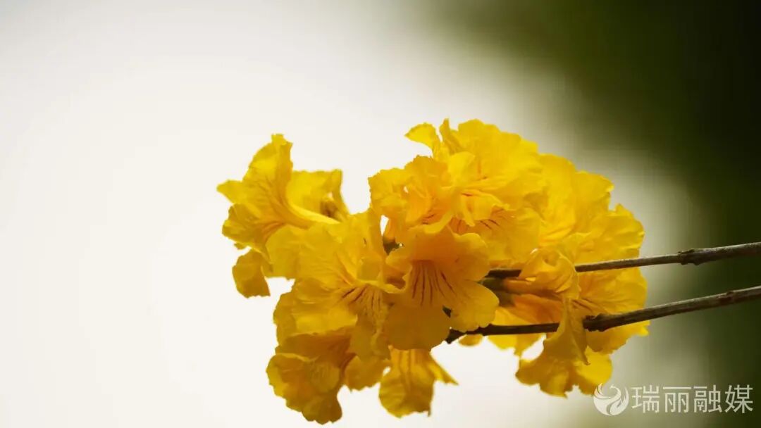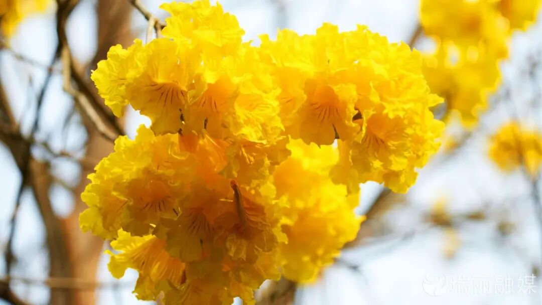 黄花风铃木又名黄钟木,先花后叶,漏斗状花冠簇生枝头,形似风铃,在暖阳下流光溢彩。眼下正值最佳观赏期,枝头无叶、繁花满冠,远观如金色云霞铺展,近看风铃轻垂、随风轻摇,宛若奏响春日序曲。金黄花簇与瑞丽的蓝天、傣寨风情、边境烟火相融,一步一景,皆是诗意。