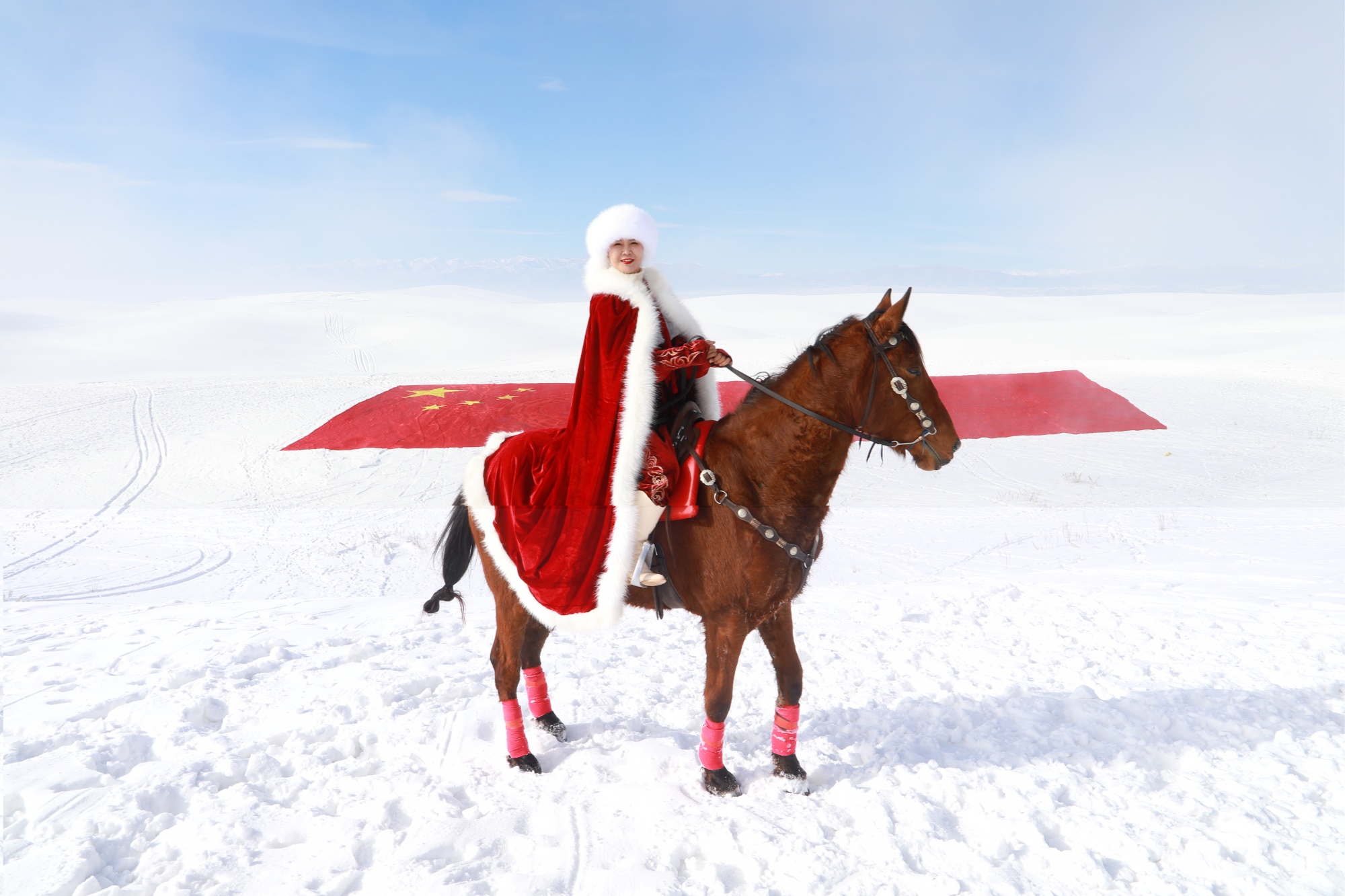 摄影师海沙尔又一次来到天马湖畔。他架起无人机,看着屏幕里的茫茫雪原,恍惚间,那个身披红色斗篷的身影仿佛又出现了——她策马奔腾,雪花飞扬,像一团火,燃烧在这片她深爱的土地上。