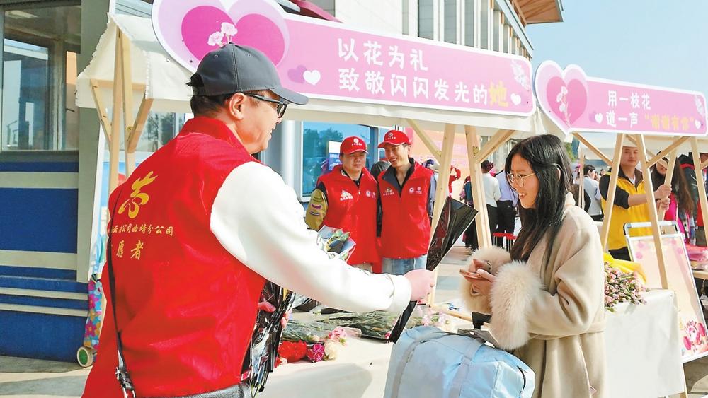 志愿者在曲靖北站为女性旅客送上鲜花。本报记者 隋鑫 摄