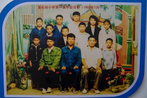 这是农加贵(前排左二)与落松地小学第一届毕业生、当地村干部的合影。 新华社发