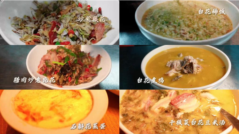 走进西盟县勐梭镇的农家小院,一阵阵花香与食物香中,人们正忙着制作一桌丰盛的“鲜花宴”。炒紫藤花、白花稀饭、腊肉炒老瓦花、白花煮鸡、油炸白花、石斛花蒸蛋、干板菜白花豆米汤……一道道以鲜花为主要食材的菜肴色香味俱全,令人垂涎欲滴。