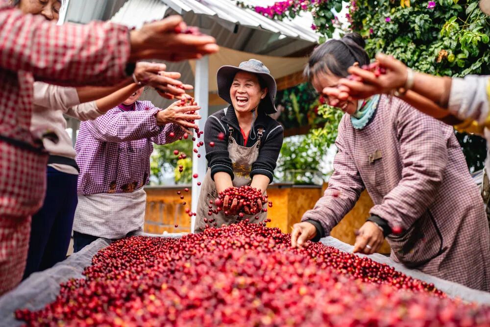 在云南省普洱市思茅区天玉咖啡庄园,庄园经营者和工作人员庆祝咖啡丰收。新华社记者胡超 摄