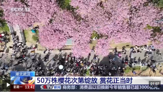 据了解,目前,武汉全市樱花种植超50万株,涵盖早、中、晚多个花期品种,分布在景区、公园、江滩等多处。眼下,早樱已进入最佳观赏期,中樱将在3月17日左右迎来盛花期,直到清明节前后,武汉都处于赏樱花的好时节。