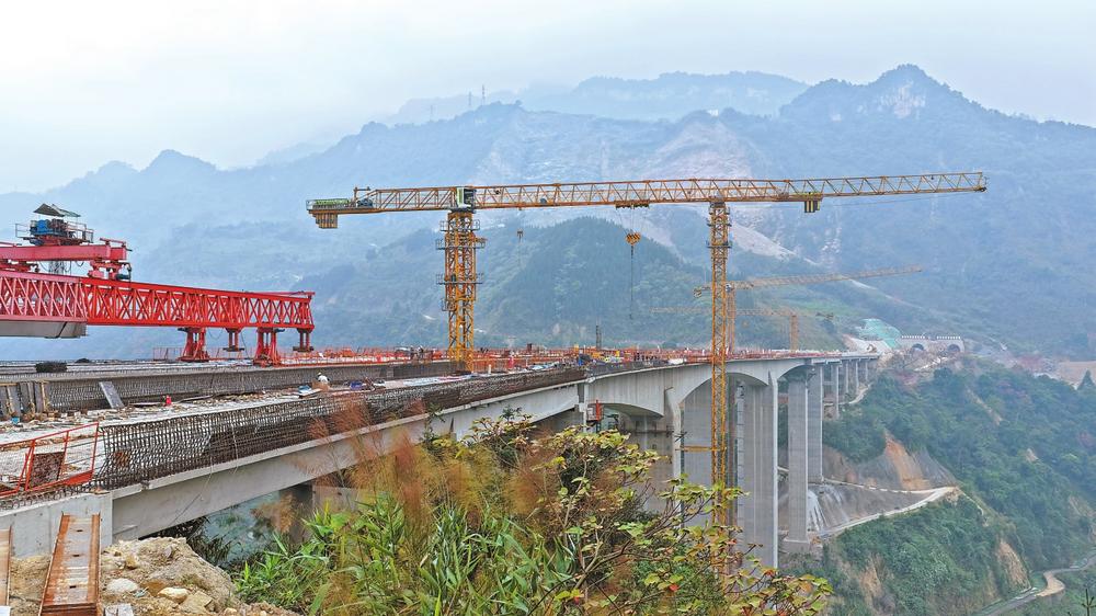 达比河大桥全长587米,主桥采用连续刚构桥型设计,跨越深达214米的峡谷,桥址区属构造侵蚀低中山地貌区,地质坚硬,气候复杂,施工难度大。中交二航局项目团队根据地形特点科学设计修建施工便道、钢栈桥与钢平台,结合人工挖孔和冲击钻施工方式完成桩基施工,在保障质量安全的同时加快施工进度。在施工组织上,项目部采取错峰施工应对极端高温,合理规划工序安排,抢抓旱季施工,充分运用施工黄金期,有序组织机械设备和人员进场,细化责任分工,确保各项工作部署到位、落实到底,安全高效实现全桥双幅贯通。