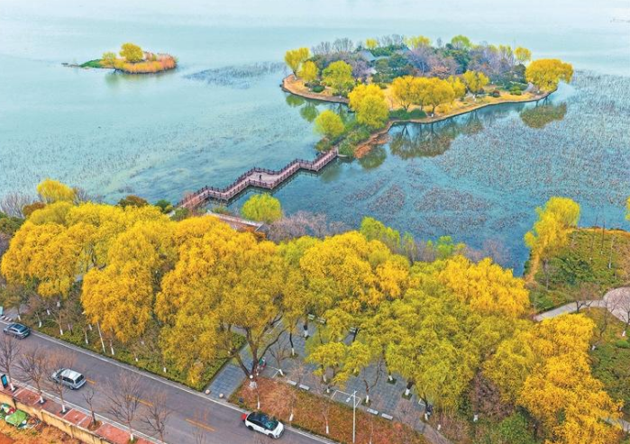 3月17日上午,春日云龙湖,嫩柳披金、木桥卧波,游人漫步其间,共赴一场温柔的春日之约。(徐州日报 记者齐浩 摄)