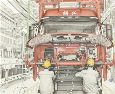坐落于吉林省长春市的一汽解放J7整车智能工厂内,工人们开足马力抓紧生产。AI修饰生成素描画 |