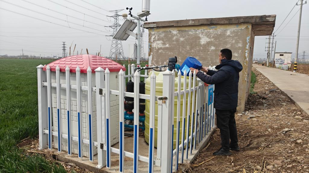 3月18日,在河南省鹤壁市淇县,当地农民正在利用水肥一体化设备为麦田施肥。(王家胜 摄)