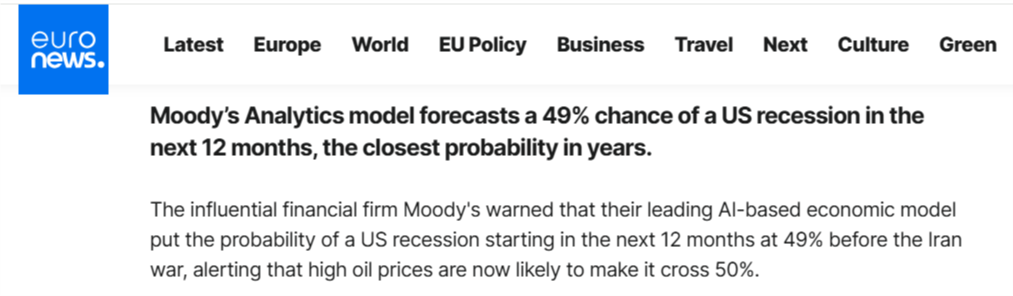 美政府接连出手的背后是疲软的经济与通胀的预期无法承受高油价。而放任针对能源基础设施的袭击将进一步威胁全球能源供应,推高油价。目前美国汽油价格已飙升至自2023年以来的最高水平,而据欧洲新闻台3月18日报道,穆迪分析(Moody's Analytics)模型预测,未来12个月内美国经济陷入衰退的概率为49%,这是多年来最接近临界点的一次。该模型还提醒称,当前高企的油价很可能使这一概率突破50%。