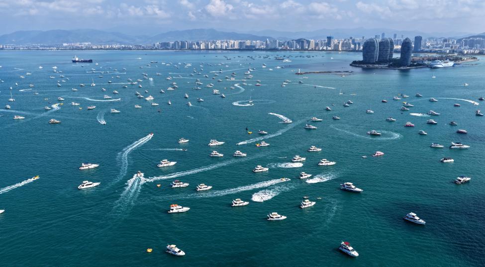 2月21日,游客在三亚乘船游玩(无人机照片)。新华社记者赵颖全/摄
