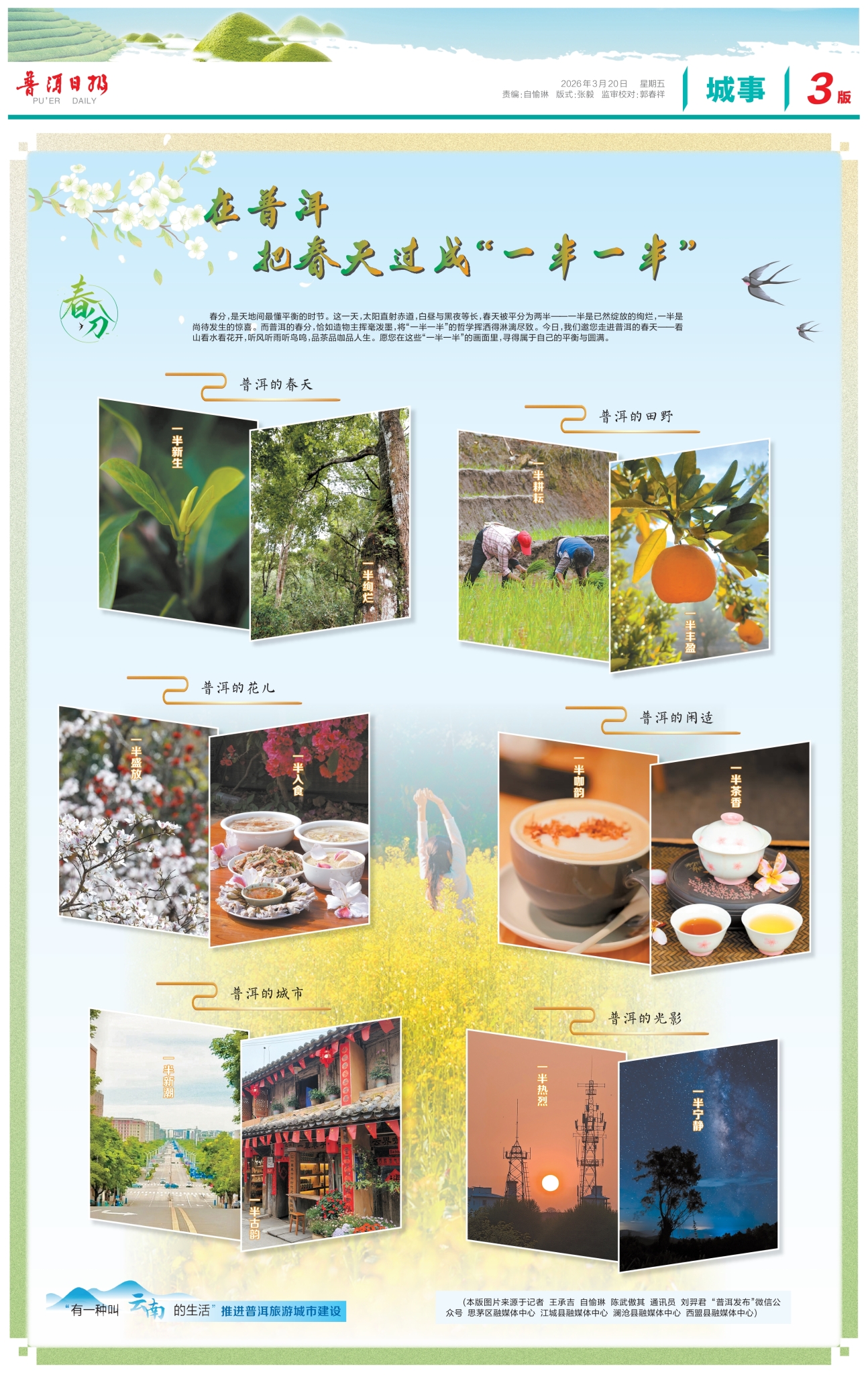 春分,是天地间最懂平衡的时节。这一天,太阳直射赤道,白昼与黑夜等长,春天被平分为两半——一半是已然绽放的绚烂,一半是尚待发生的惊喜。而普洱的春分,恰如造物主挥毫泼墨,将“一半一半”的哲学挥洒得淋漓尽致。今日,我们邀您走进普洱的春天——看山看水看花开,听风听雨听鸟鸣,品茶品咖品人生。愿您在这些“一半一半”的画面里,寻得属于自己的平衡与圆满。(本版图片来源于记者 王承吉 自愉琳 陈武傲其 通讯员 刘羿君 “普洱发布”微信公众号 思茅区融媒体中心 江城县融媒体中心 澜沧县融媒体中心 西盟县融媒体中心)