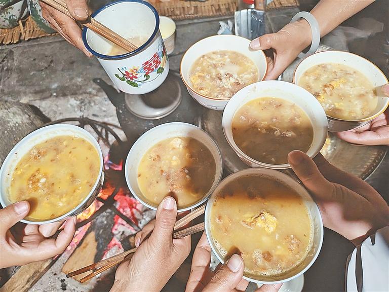 切几片凝固的牛油放入火塘上架着的铁锅中,待油脂慢慢融化,变得香气四溢,将打散的鸡蛋液倒入热油中翻炒至金黄焦香,再用筷子将蛋饼拨成小块,冲入滚烫的开水。待锅里汤水翻腾,舀入傈僳族自酿的白酒,搅拌片刻,一锅集牛油浓香、白酒醇香、鸡蛋酥香于一体的美味便新鲜出炉。根据个人口味,添一勺红糖、加一匙炼乳或是撒少许盐,盛上一碗趁热品尝,暖意从舌尖直达心底,火苗的“噼啪”声与亲友的谈笑声交织,奏响幸福的生活乐章。
