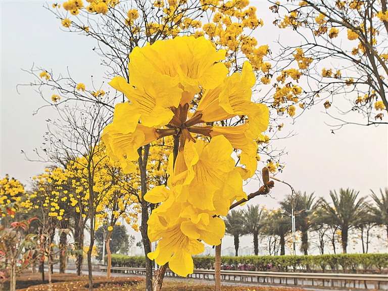 沿街而行,高大的风铃木正擎起了金色的旗帜。一树树明黄的花簇,恰似无数小巧的风铃,在晴空下熠熠生辉。“晴空一铃摇春色,满树金黄向天涯”——它们不攀附、不迎合,只是执着地向着阳光生长,将整条街道晕染成了温暖的色调。偶尔一阵风掠过,花瓣便如碎金般簌簌飘落,铺就一地诗意,也点亮了行人的目光。